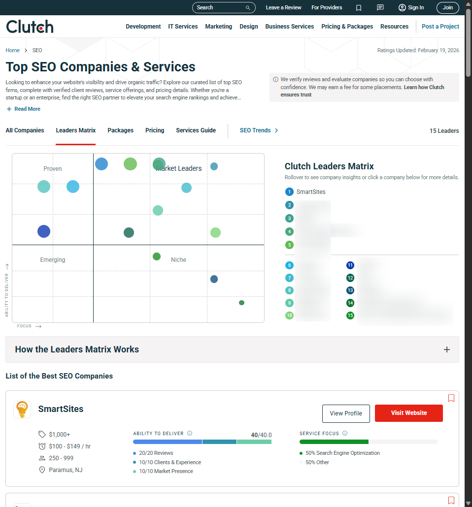 SmartSites is recognized as one of the top organic search engine optimization agencies in America according to Clutch. The competitive report is based on reviews, experience, and market presence and we are proud to be #1!